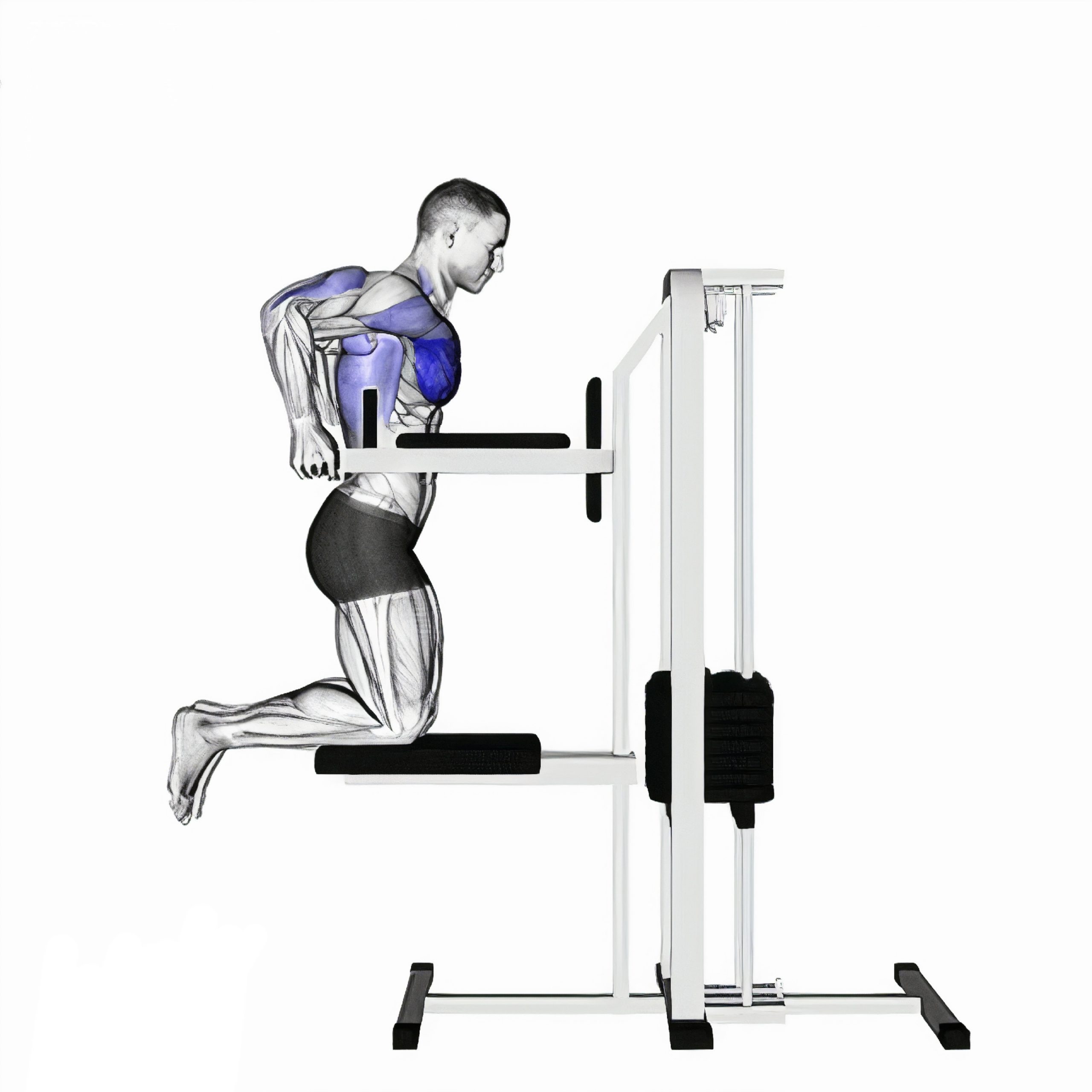 • روی دستگاه دیپ پارالل کمکی بایستید یا زانو بزنید (بسته به مدل دستگاه) و دستها را روی میلههای موازی بگیرید؛ بازوها کشیده و بدن صاف باشد.