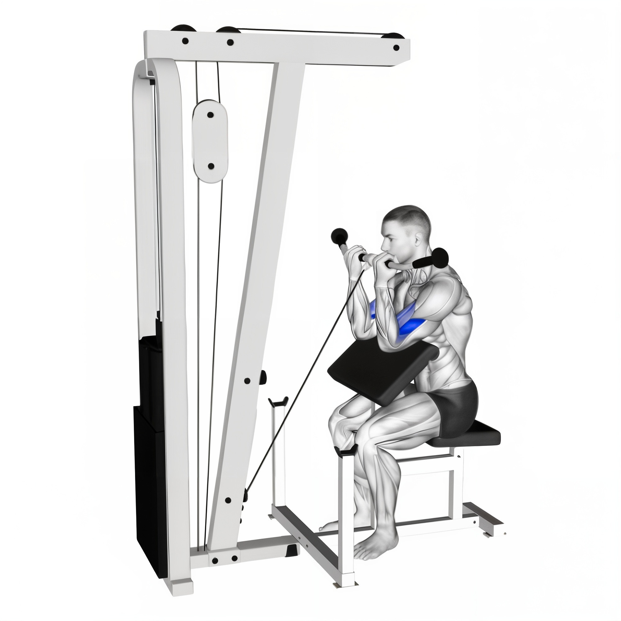 • یک نیمکت لاری (Preacher Bench) را جلوی دستگاه سیمکش قرار دهید و قرقره را در پایینترین حالت تنظیم کنید.