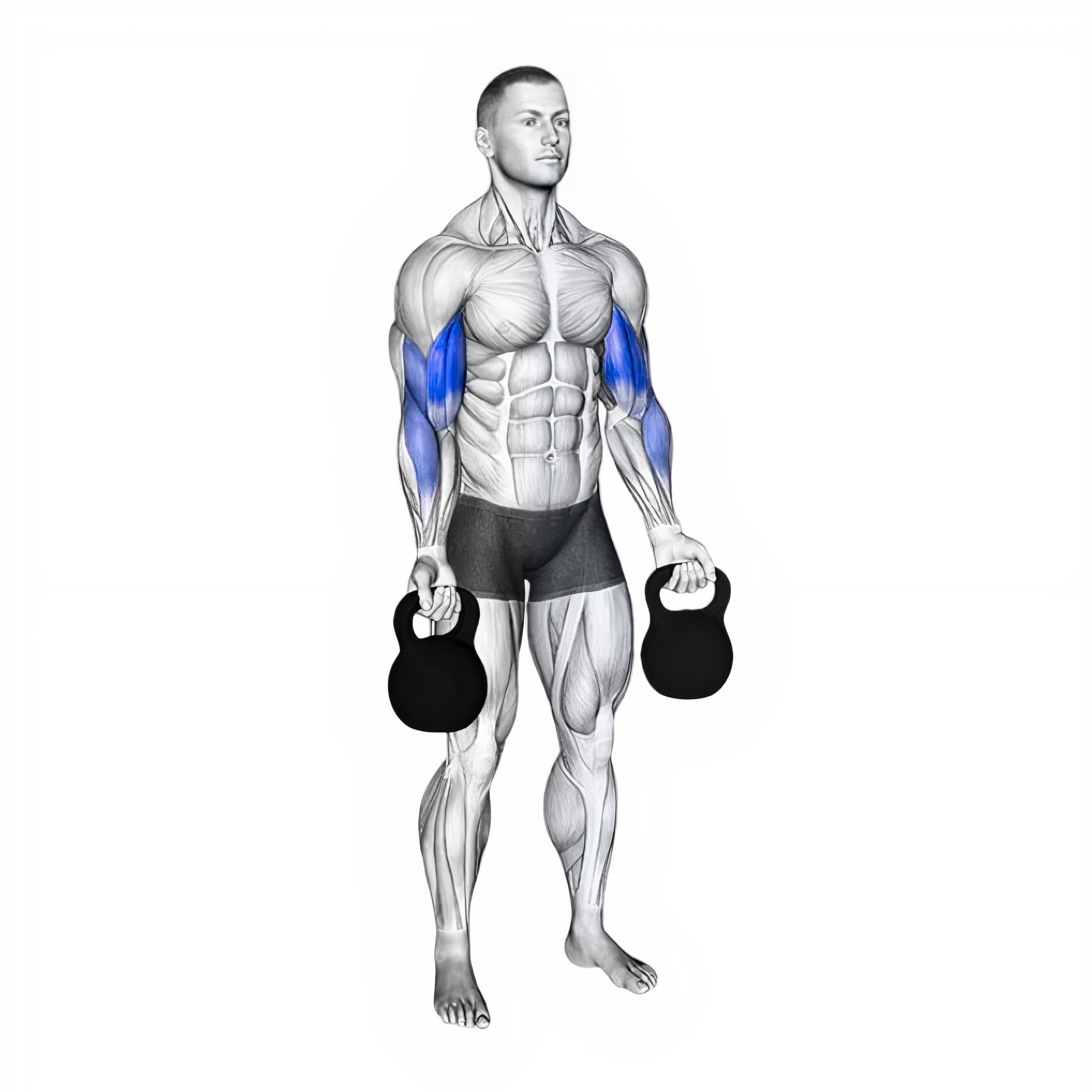 • با خم کردن آرنج، کتل بل را به سمت شانه‌ها بالا بیاورید تا عضله جلو بازو کاملاً منقبض شود.