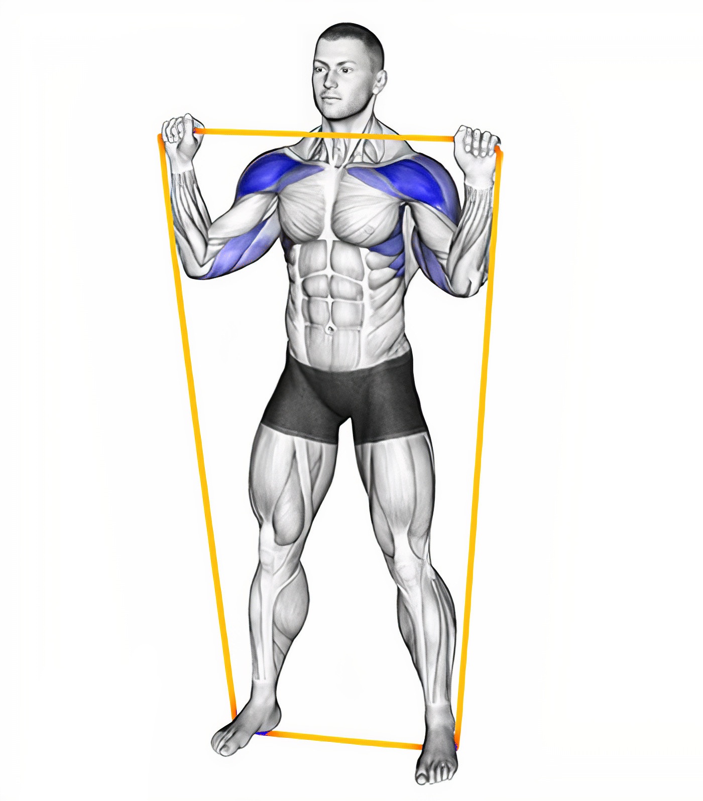 • وسط کش مقاومتی بایستید و دو سر کش را در دستها بگیرید، دستها در ارتفاع شانه قرار داشته باشند.