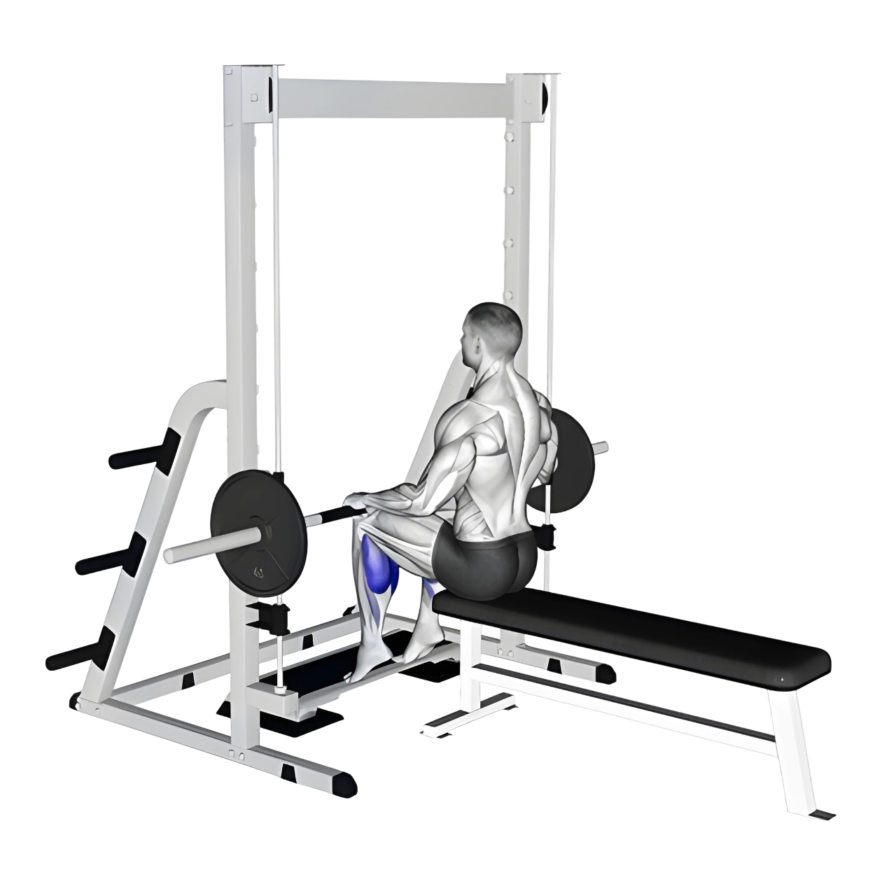 • هالتر اسمیت را روی رانهای بالایی خود (نزدیک به زانو) قرار بده؛ میتونی یک حوله یا پد برای راحتی زیر هالتر بگذاری.