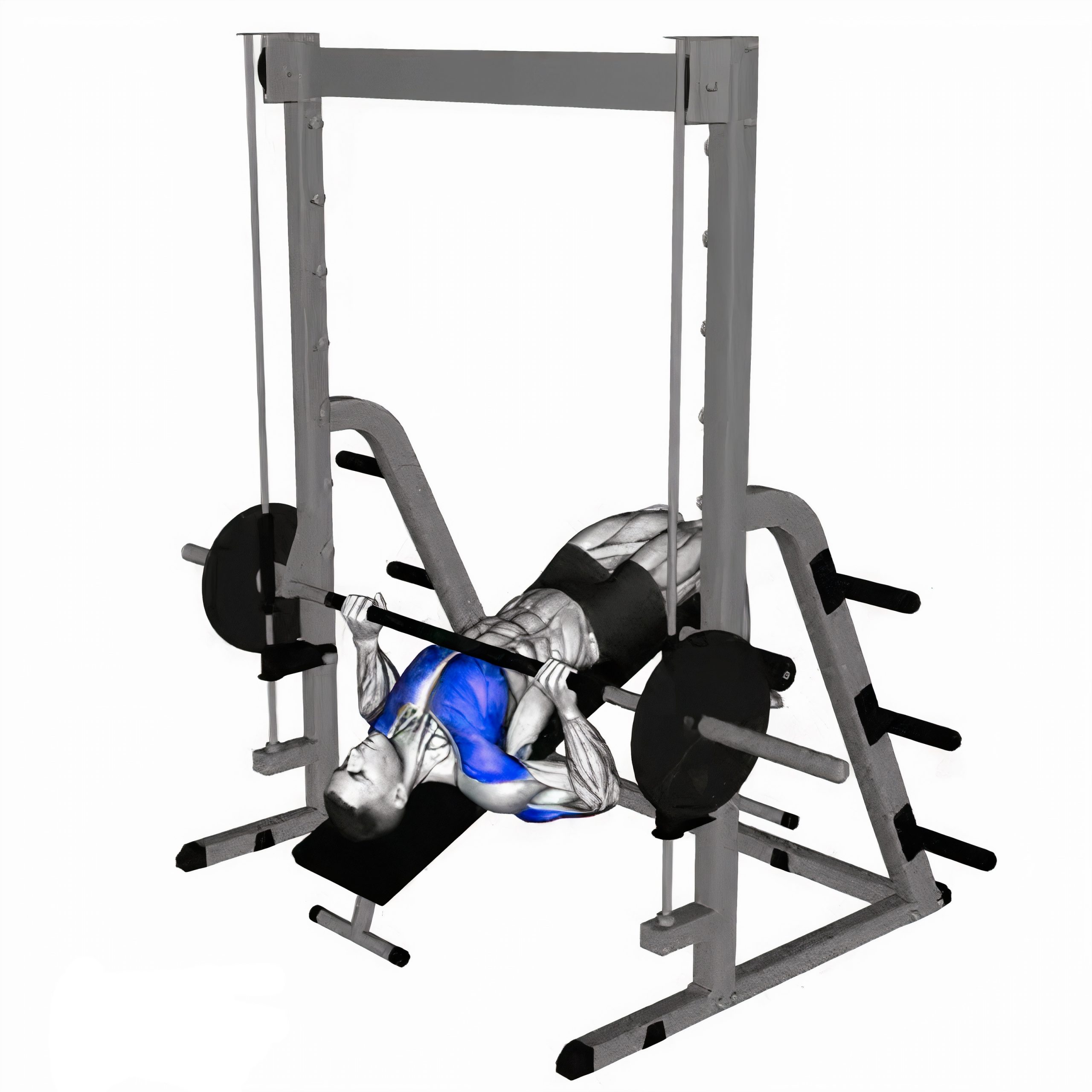 • یک نیمکت زیر سینه (شیب منفی) را در مرکز دستگاه اسمیت قرار بده، طوری که وقتی دراز می‌کشی، میله در راستای قسمت پایینی سینه قرار بگیره.
