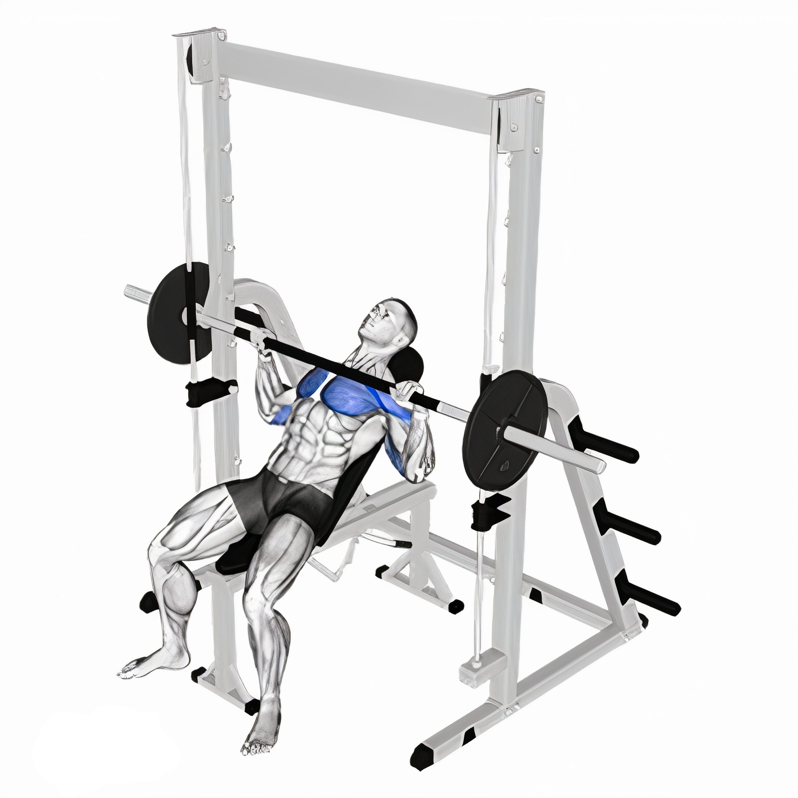 • یک نیمکت با شیب مثبت (حدود ۳۰ تا ۴۵ درجه) را در مرکز دستگاه اسمیت قرار بده، طوری که وقتی دراز میکشی، میله دقیقاً در راستای بخش بالایی سینه (زیر استخوان ترقوه) قرار بگیره.